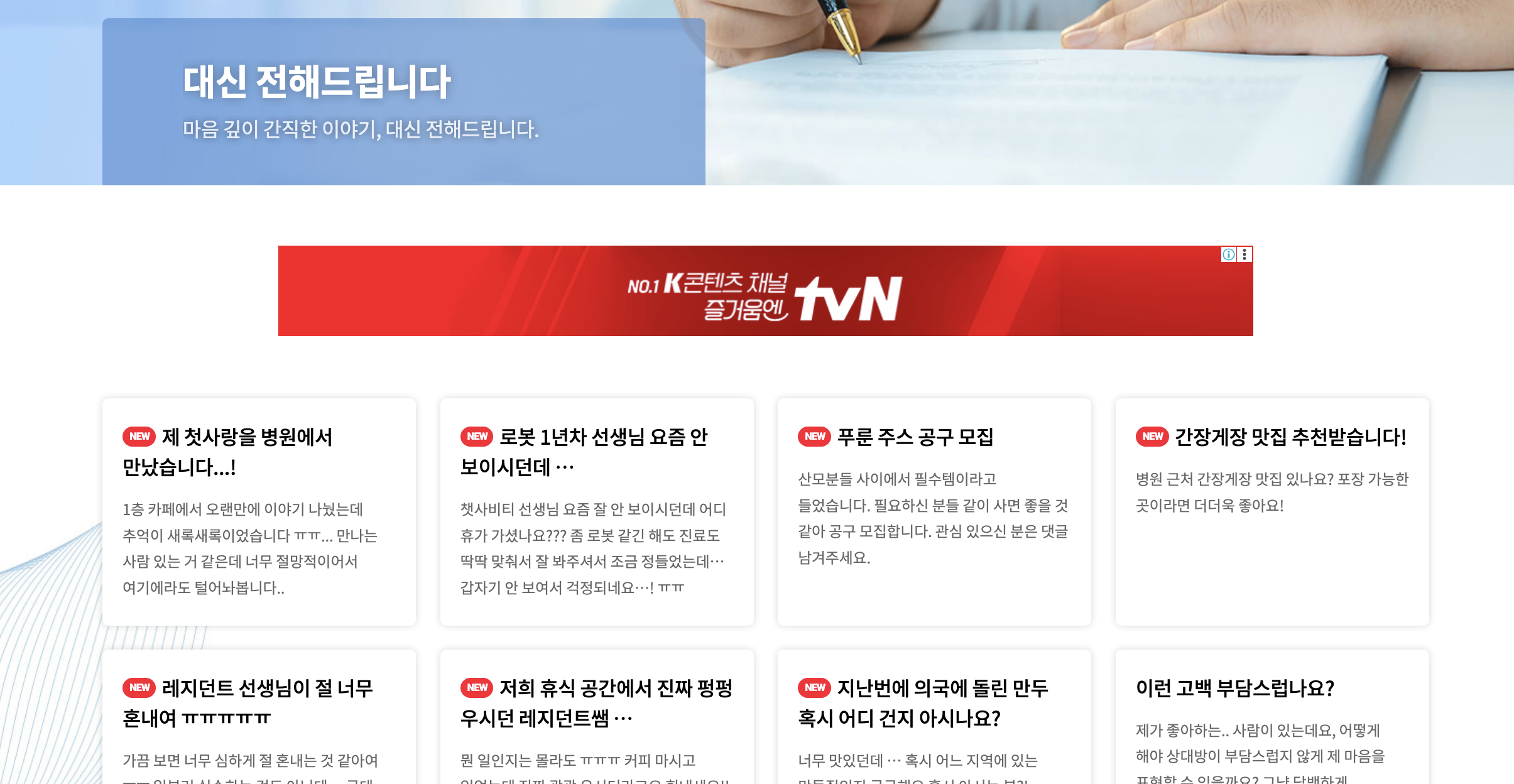 대신 전해드립니다는 이제 등장인물들이 작성한 것 같은 글들이 올라오는데 약간 다음 화 스포의 역할도 하고, 각 인물들의 감정을 표현하고 있어서 꽤나 재미있게 보고 있다.